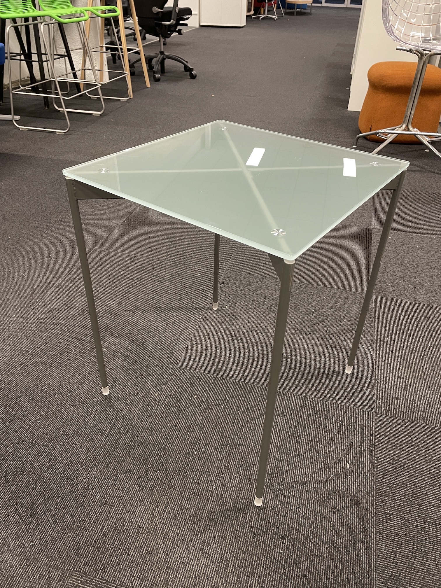 Brukt lounge bord i frosta glass og blanke bein.