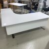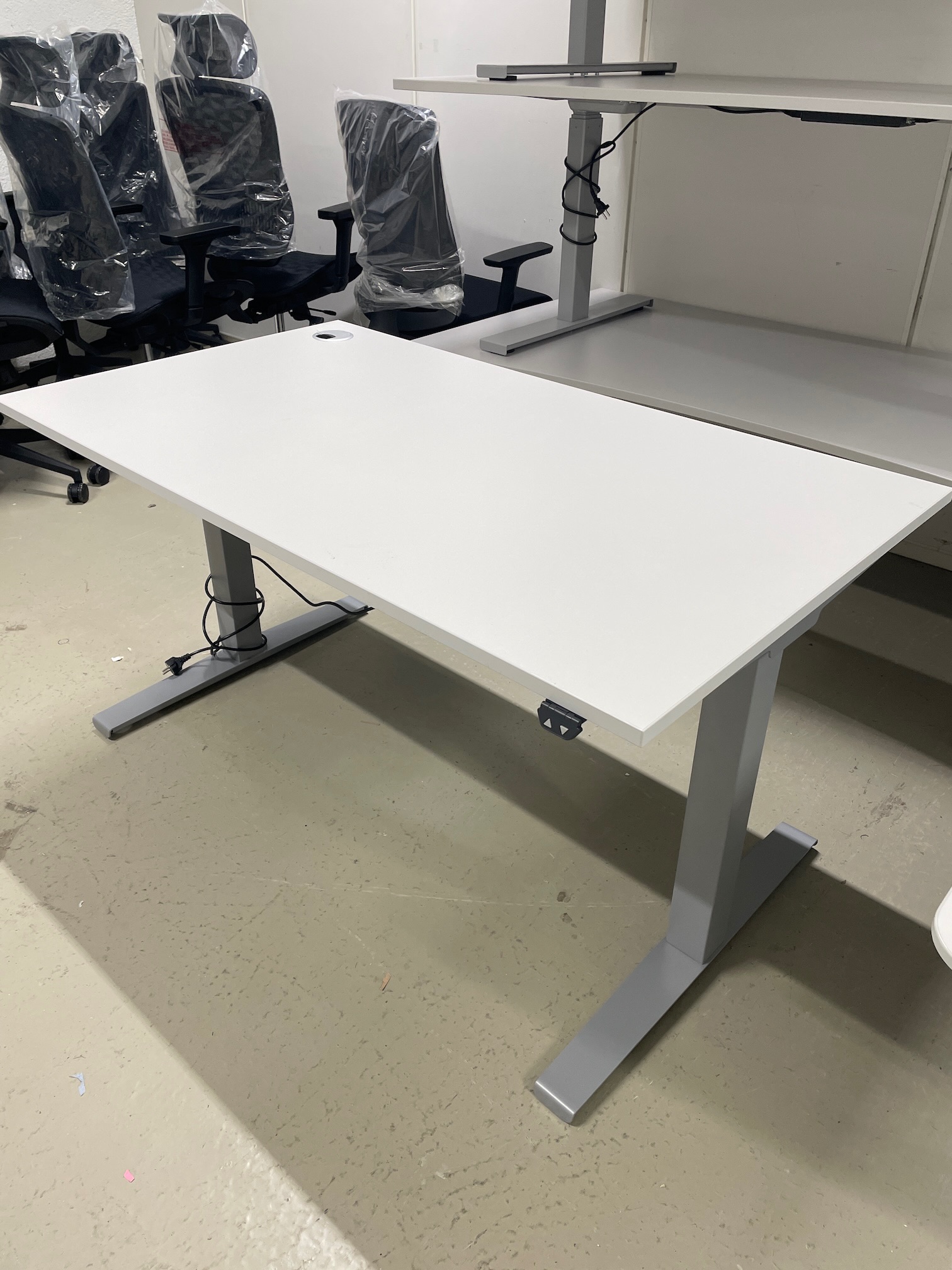 Pent brukt kontorpult, lys grå med grå bein.