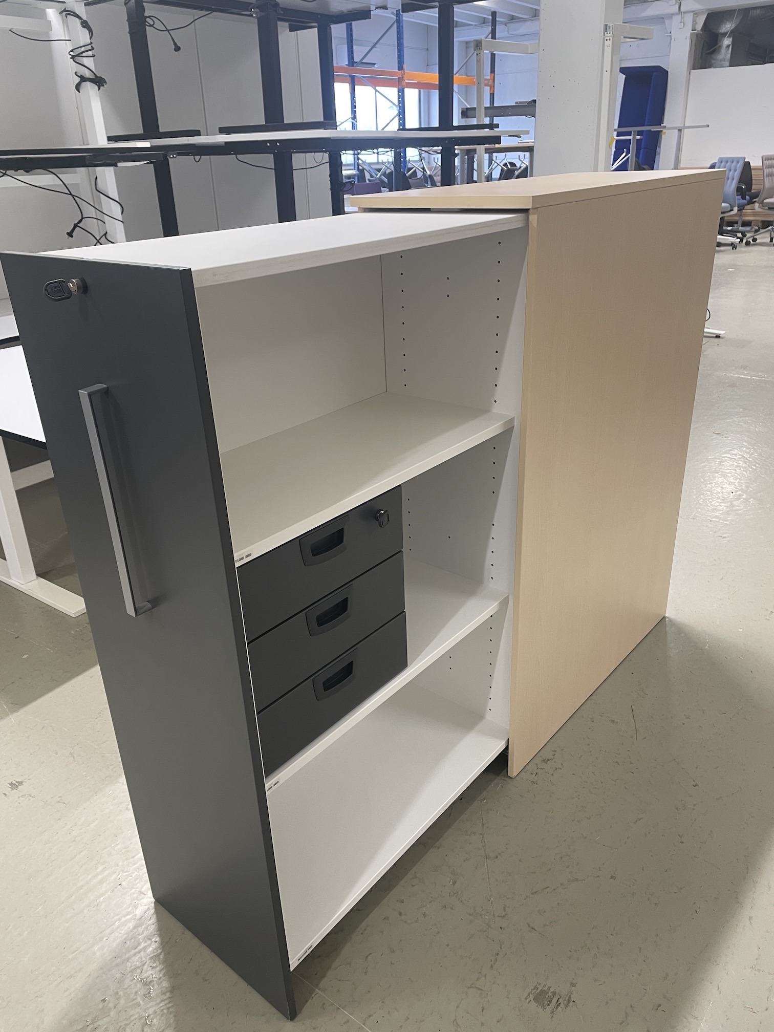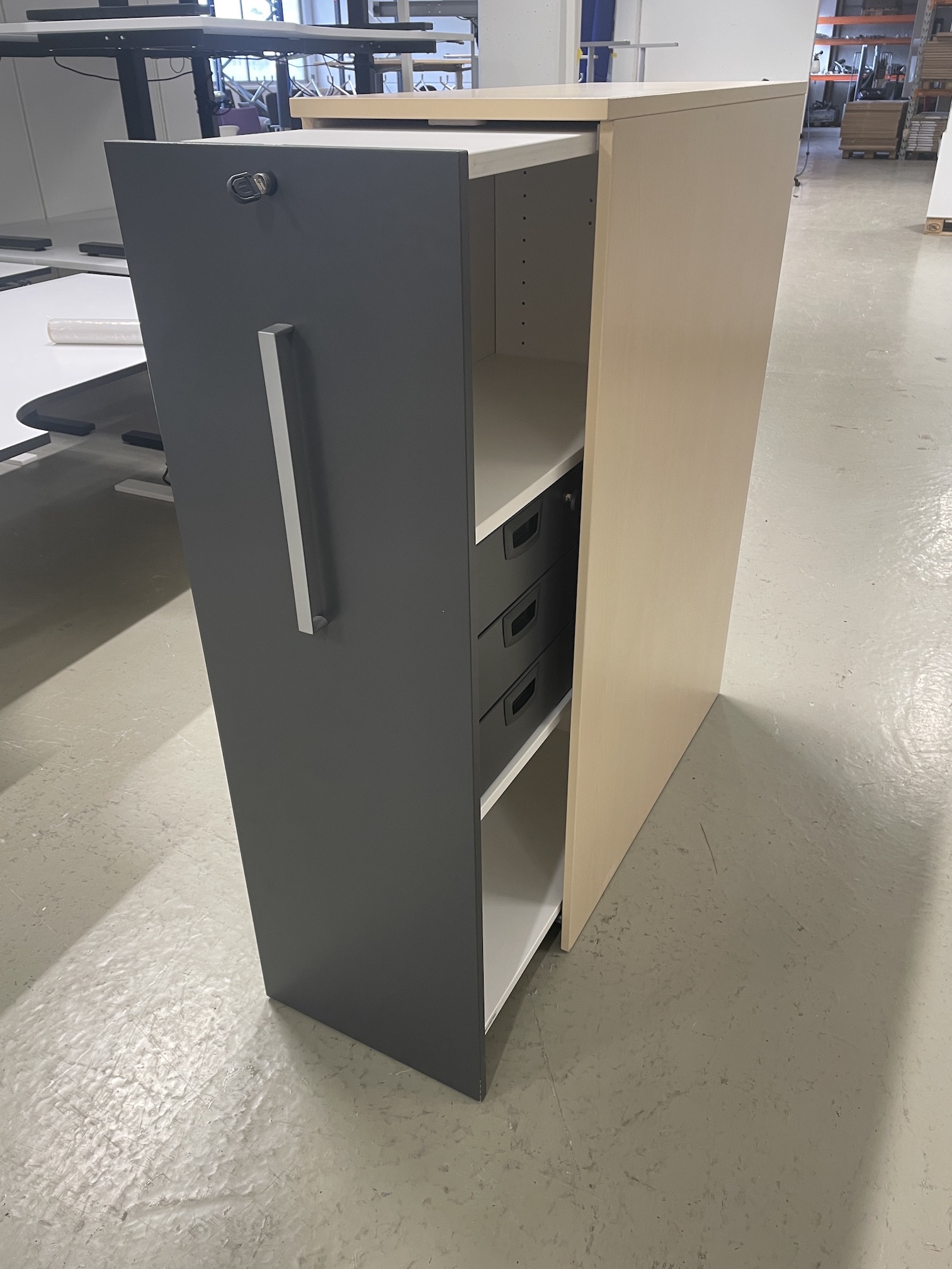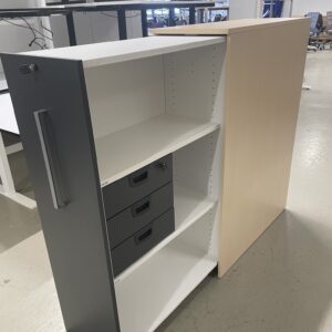 Kinnarps 3-roms uttrekkskap med innvendig skuff. Plassering høyre/venstre side. I lys folie med mørk grå front.