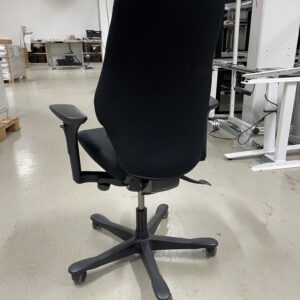 Er blitt trukket i nytt sort stoff i sete og rygg, samt har nye armlén.