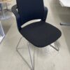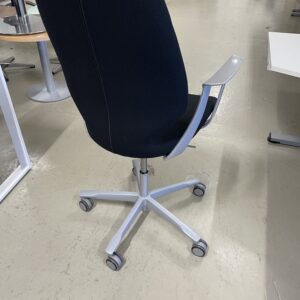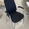 Møtestol i sort stoff fra Kinnarps, med grå armlén, lift og hjul.