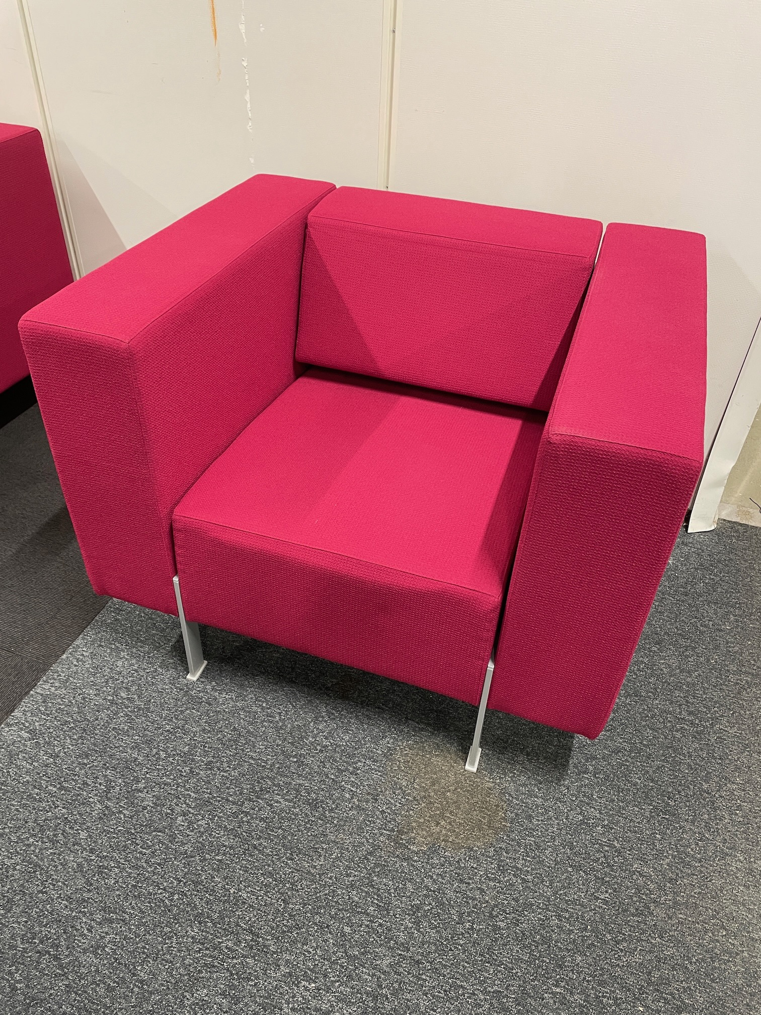 Pent brukt 1-seter fra Kinnarps i rødlig stoff og grå lakkerte bein.